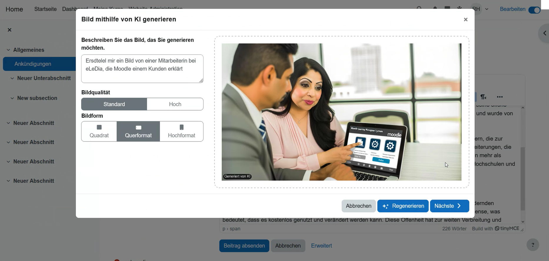 (TinyMCE) integriert. Das vereinfacht die Erstellung von Inhalten und spart Zeit und Mühe. Diese Funktion steht all Ihren Moodle-Benutzern mit den entsprechenden Berechtigungen zur Verfügung.